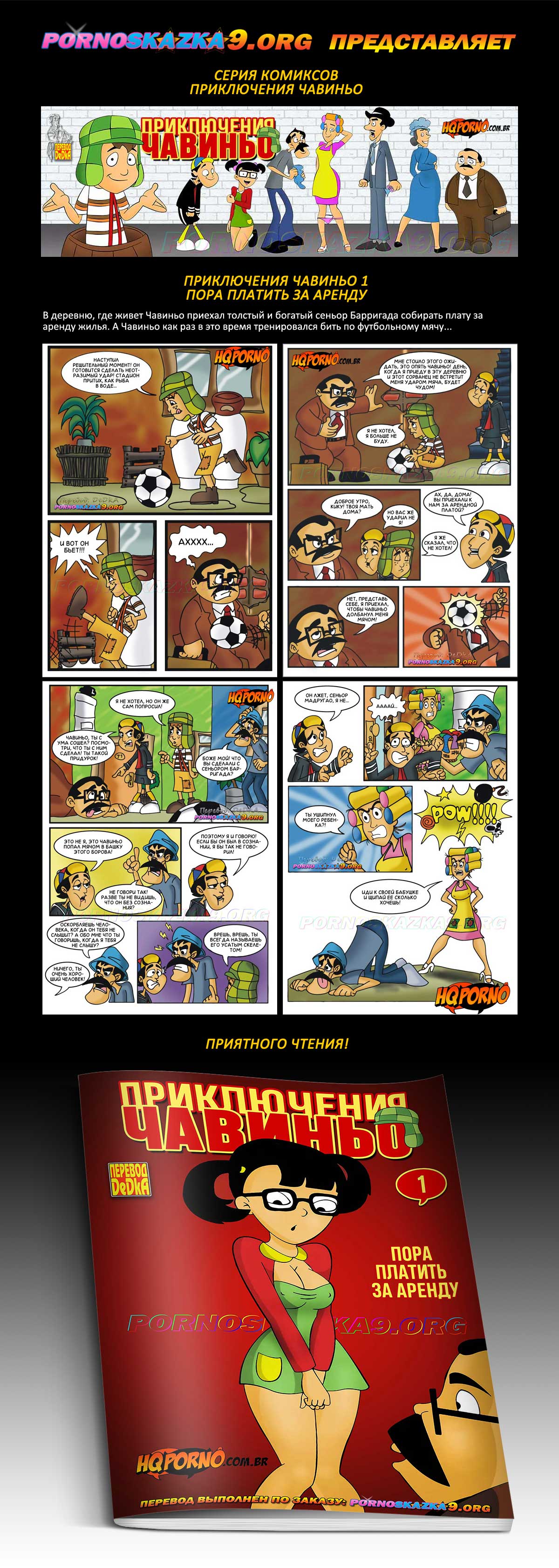 Порно комикс «Приключения Чавиньо. Часть 1. Пора платить за аренду.» В деревню, где живет Чавиньо приехал толстый и богатый сеньор Барригада собирать плату за аренду жилья. А Чавиньо как раз в это время тренировался бить по футбольшому мячу…